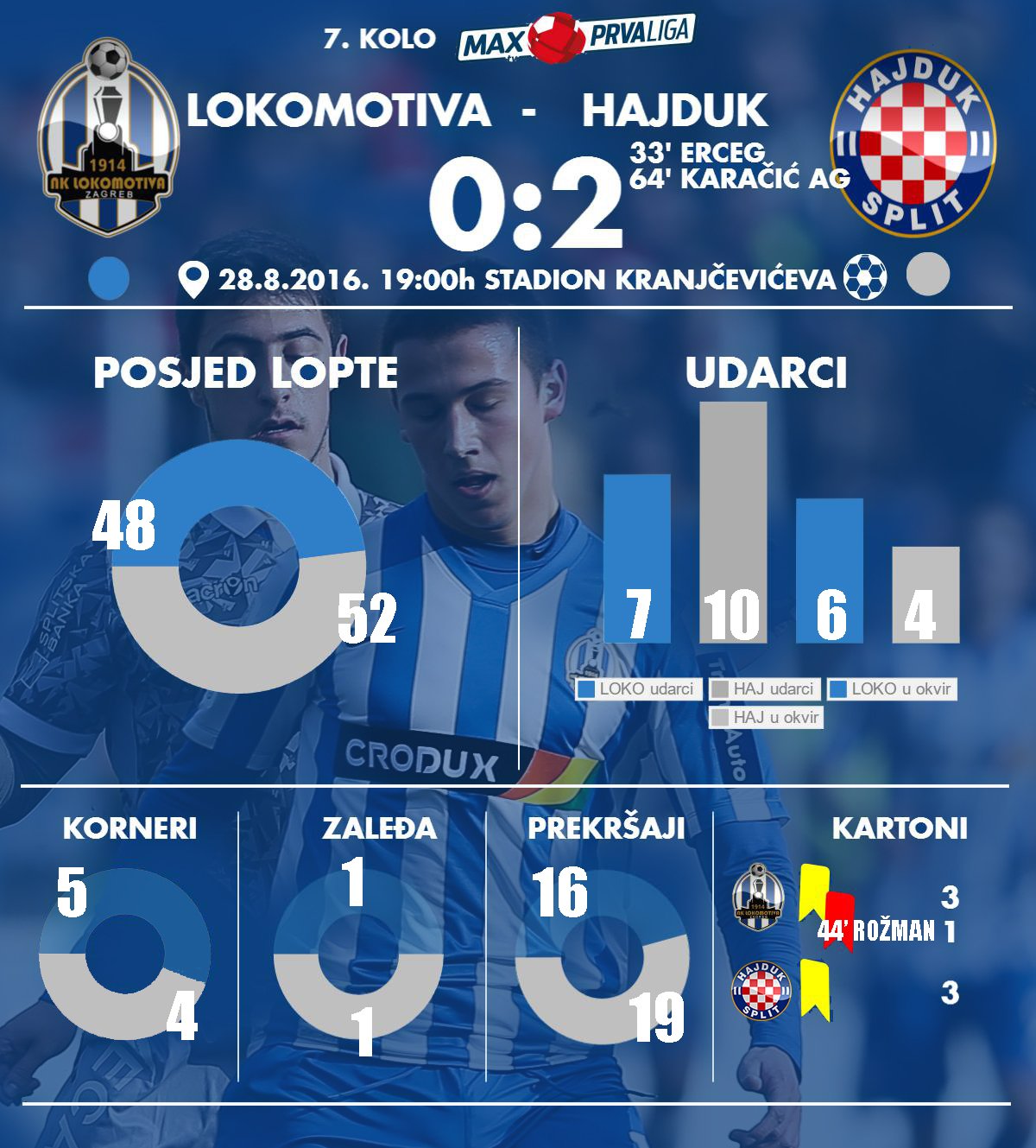 U nastavku utakmice Lokomotiva je s igračem manje stajala jako dobro na terenu, međutim iz kornera je Hajduk poveo 0:2. autogolom Karačića.
