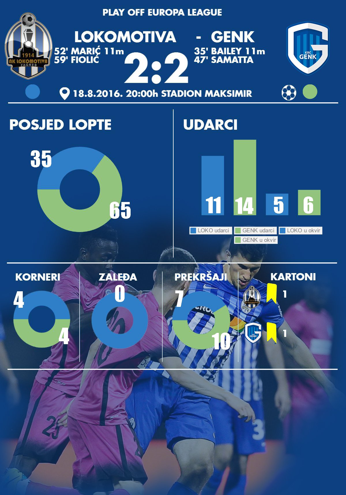Lokomotiva i Genk odigravajuu  prvoj utakmici doigravanja za ulazak u Europsku ligu odigrali su na Maksimiru 2:2. Strijelci za Lokose bili su Marić i Fiolić,